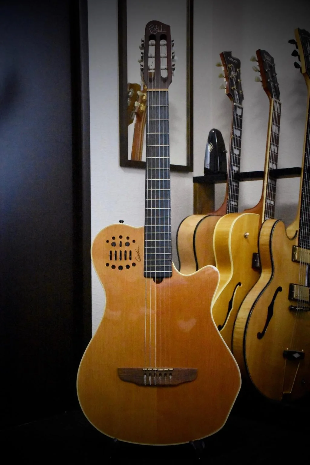 このギターは7年位前にたまたま立ち寄った島村楽器でたまたま弾かせてもらったら気に入ってしまって買ってしまったんですがGodinのクラシックギターは実は2回目の購入でした。最初に買ったのもGrand Concertなんとかというもので出力にXLR端子が付いていてローズウッド指板のものでした。これは最初に手にとったときふーんこんなもんかという感じで特に良くも悪くもない感じだったんですが何かの機会でOvationのナイロンを弾いたとき、何だこれGodinより全然良いじゃんということになり買い替えてしまいました。それからしばらくしてある日たまたま弾かせてもらったGrand Concert SAなんですが先に持ってたGodinもOvationも糞に思えるくらい良い音がしましたのでそのまま持ち帰ったということでした。前のGodinもOvationも適当に安く売ってしまいましたが最初からこれ買っておけば良かったです。