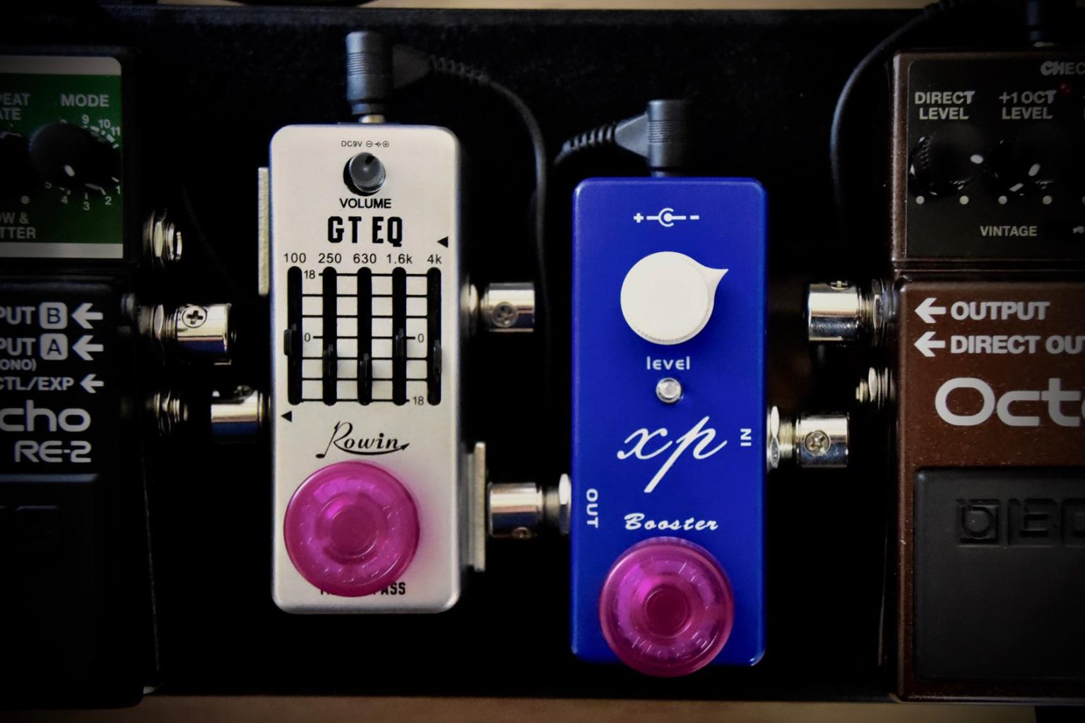 個人的にXPブースターの設定は内部のDIPスイッチは両方オフでノブは9時くらいの設定が良いかなと思いました。ノブを右に回しきっても変に歪んでしまう感じまではありませんが上げすぎるとどう弾いても音が暴れてしまって扱いづらいので9〜10時くらいが抑揚しやすいポイントと感じました。あとこれはEPの初期型のクローンだそうで掛けっぱなしならいい話ですがノブの値が0でも音量が結構上がってしまいます。色々やってみたところアンプを使って弾いている時は気持ちいいですが録音すると少し味付けが濃いという印象でした。その他の機材の状況にもよると思いますが弾いてる時は気持ちよくても聴き直すとほんのちょっとくどいかもといった感想です。